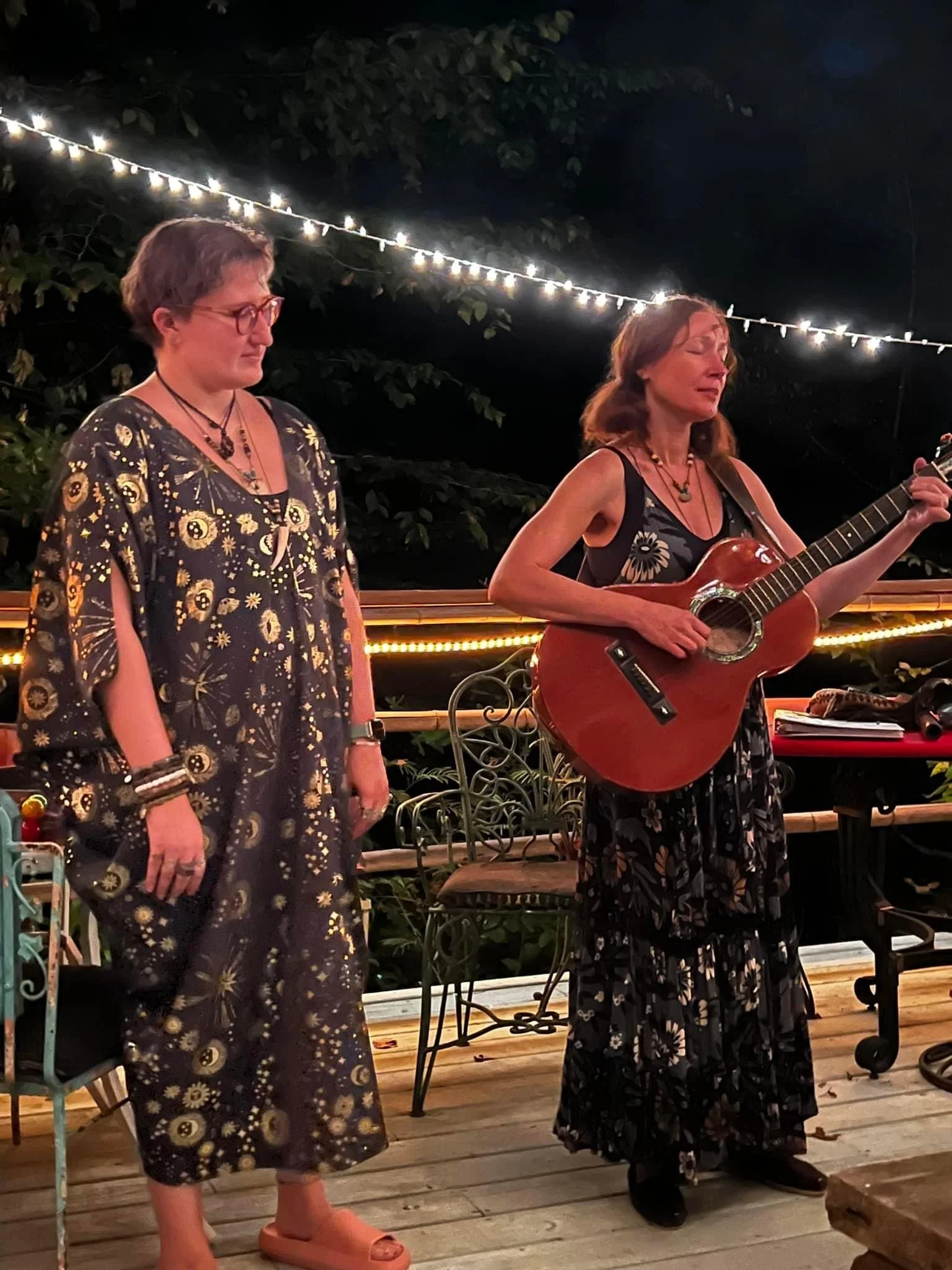 Song Sharing in the woods at Gaia Sisterhoods Wise Women Retreat. Angelica Dunsavage sang beautiful harmonies on my song, The Handless Maiden.